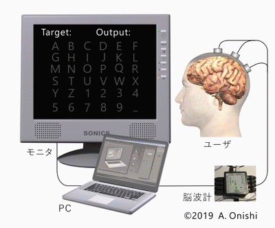 ブレイン・マシン-インタフェース(Brain-Machine Interface, BMI)もしくは, ブレイン・コンピュータ-インタフェース(Brain-Computer Interface; BCI)は 脳から生じる信号を機器の制御命令へと変換するインタフェースです. BMIにはさまざまな種類がありますが, 頭皮から計測した脳波を用いて機器を精度よく機器を制御することのできるBMIの一つである P300-based BMIが実用に近いと考え,それに焦点を当てた研究を行っております (P300-based BCI, P300型BMIとも呼ばれます).